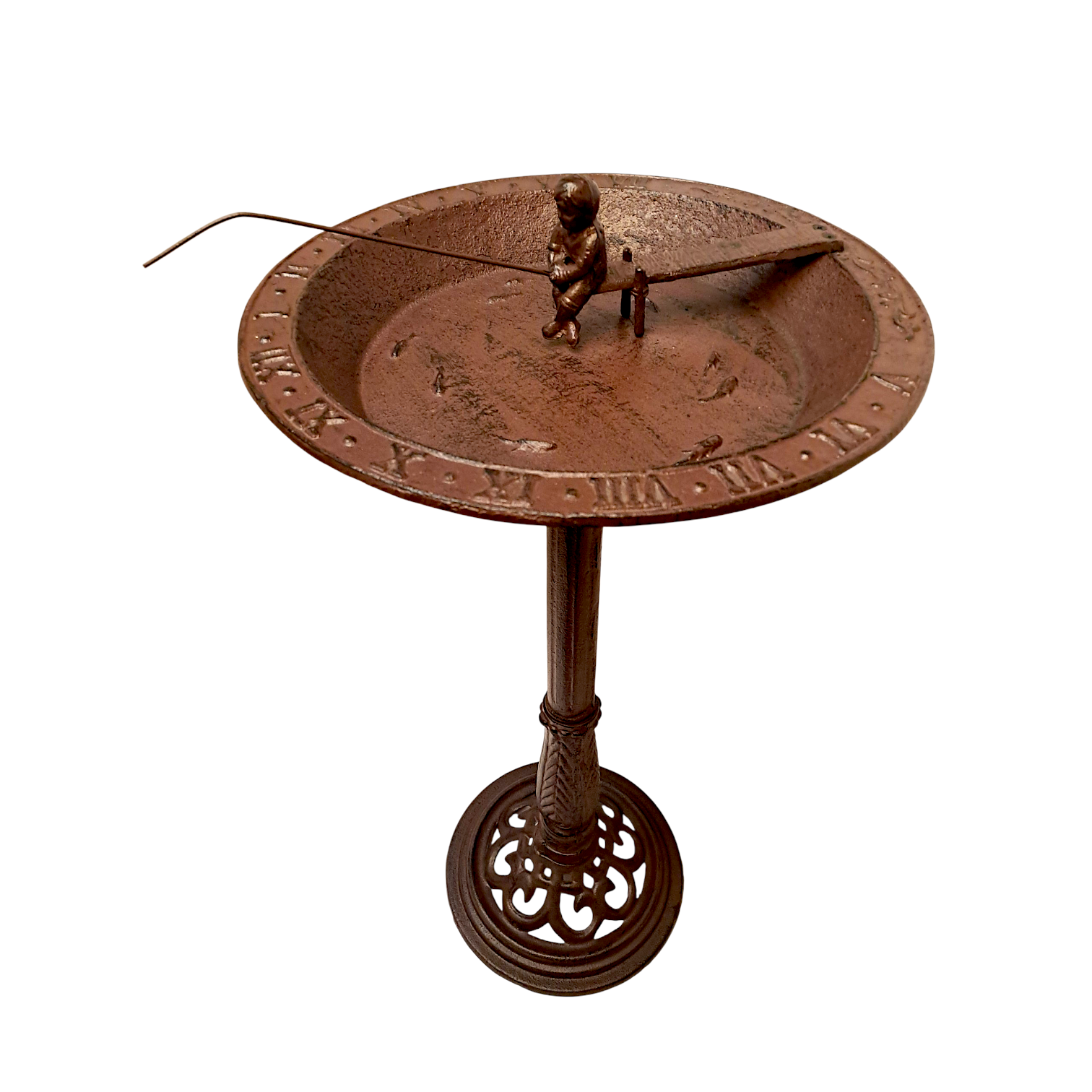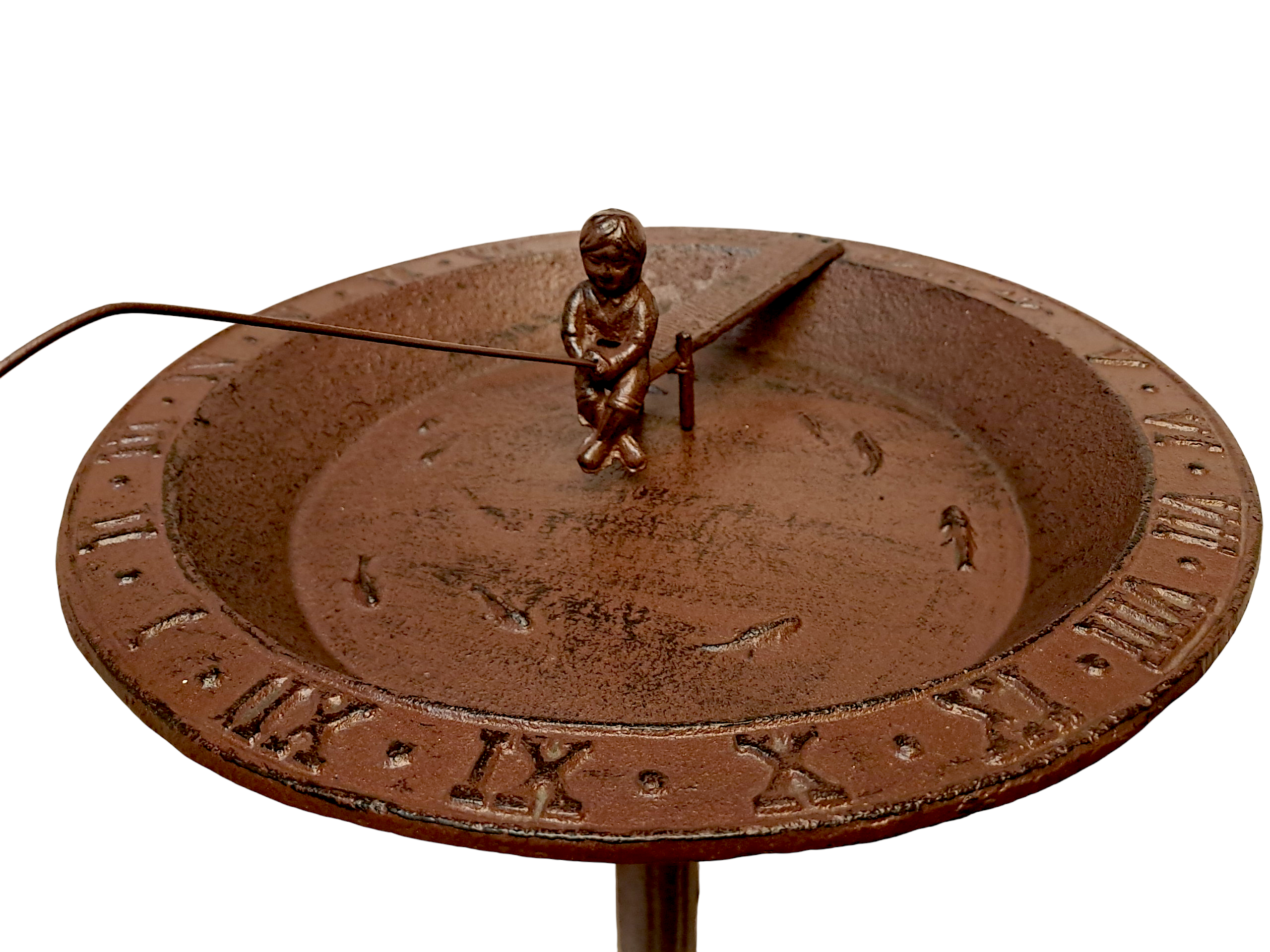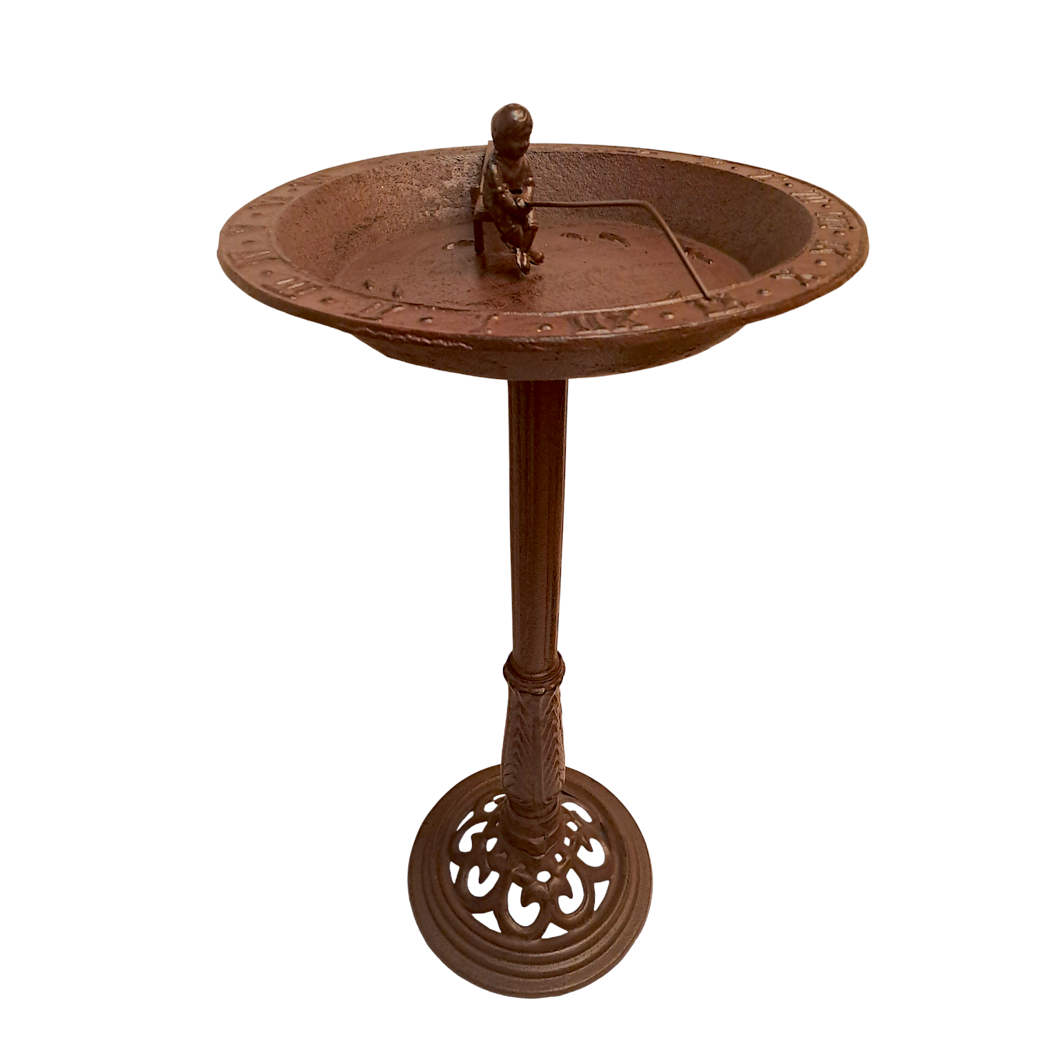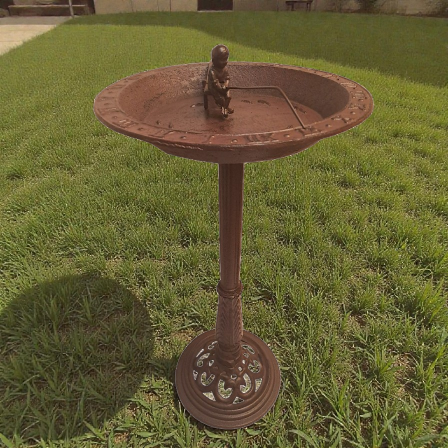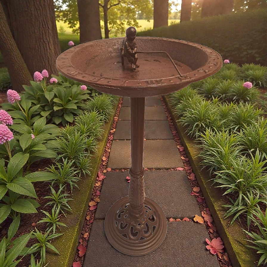 Obszerna misa została osadzona na stabilnej, ozdobnej nodze, a całość zwieńczona jest zegarem słonecznym, który podkreśla szlachetny, niemal pałacowy styl dekoracji. To połączenie funkcjonalności i symboliki sprawia, że poidełko nie tylko spełnia praktyczną rolę, ale również przypomina o rytmie natury i spokojnym upływie czasu.