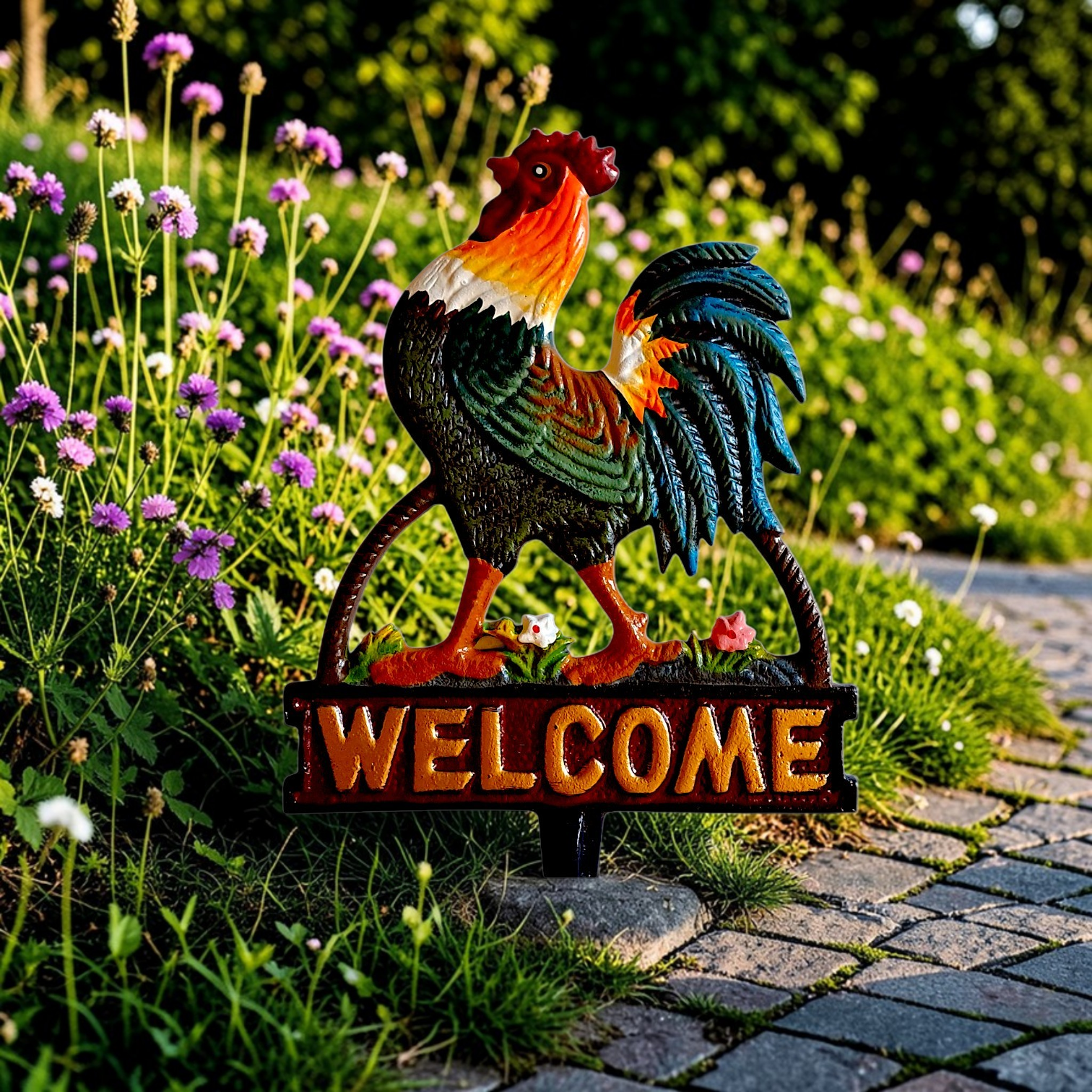 Podkreśl wyjątkowy klimat swojego domu lub ogrodu dzięki dekoracyjnej wbijanej tabliczce z napisem WELCOME i motywem kolorowego koguta. Ponadto to urokliwy detal inspirowany stylem wiejskim i rustykalnym, który już od progu wita gości ciepłą, przyjazną atmosferą.